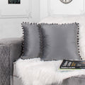 Velvet Cushion Covers Adorned With Pom Poms Set of 2, Grey