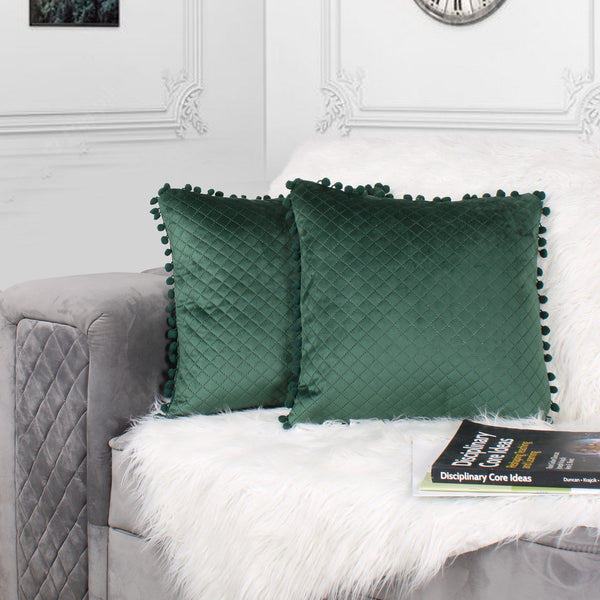 Both Side with PomPom Quilted Velvet Cushion Cover (Set of 2), Green
