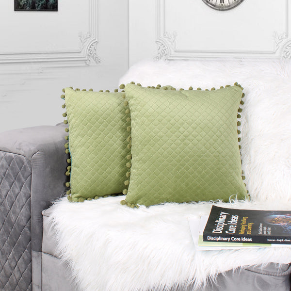 Both Side with PomPom Quilted Velvet Cushion Cover (Set of 2), Mehndi