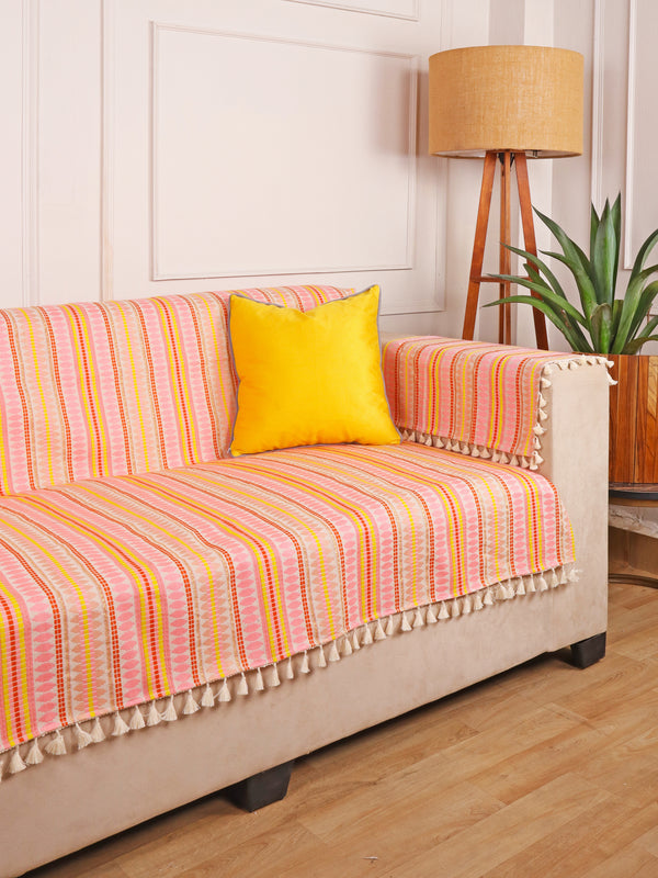 Elevate your living room with the STITCHNEST Woven Jacquard Sofa Cover, designed for full coverage and timeless appeal. Made from premium multicolor cotton fabric, this sofa cover features a traditional ethnic striped pattern with elegant tassel detailing. Ideal for festivals or everyday décor, it not only protects your sofa but also enhances your space with vibrant, handcrafted charm. The breathable woven jacquard material ensures comfort, durability, and washability—making it both functional and stylish.