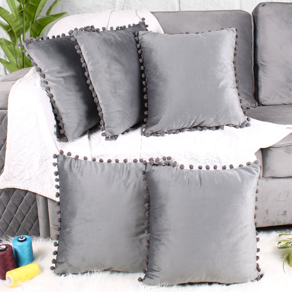 Velvet Cushion Covers Adorned With Pom Poms Set of 5, Grey