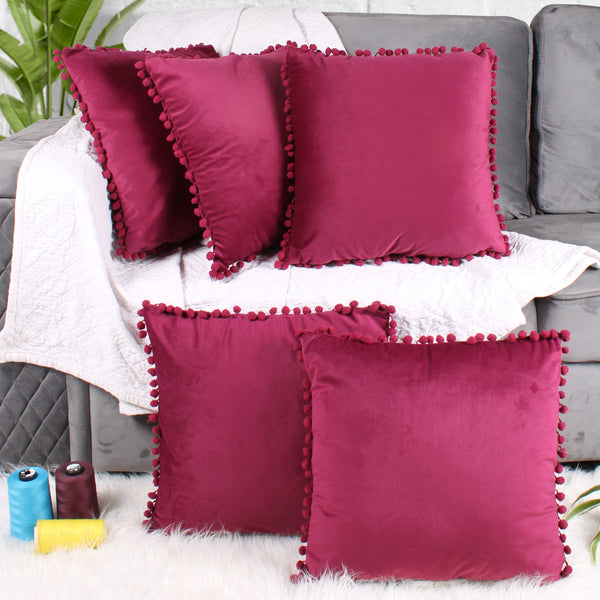 Velvet Cushion Covers Adorned With Pom Poms Set of 5, Maroon