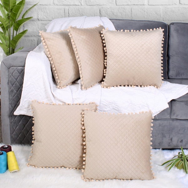 Both Side with PomPom Quilted Velvet Cushion Cover (Set of 5), Beige