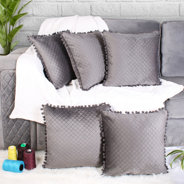 Both Side with PomPom Quilted Velvet Cushion Cover (Set of 5), Grey