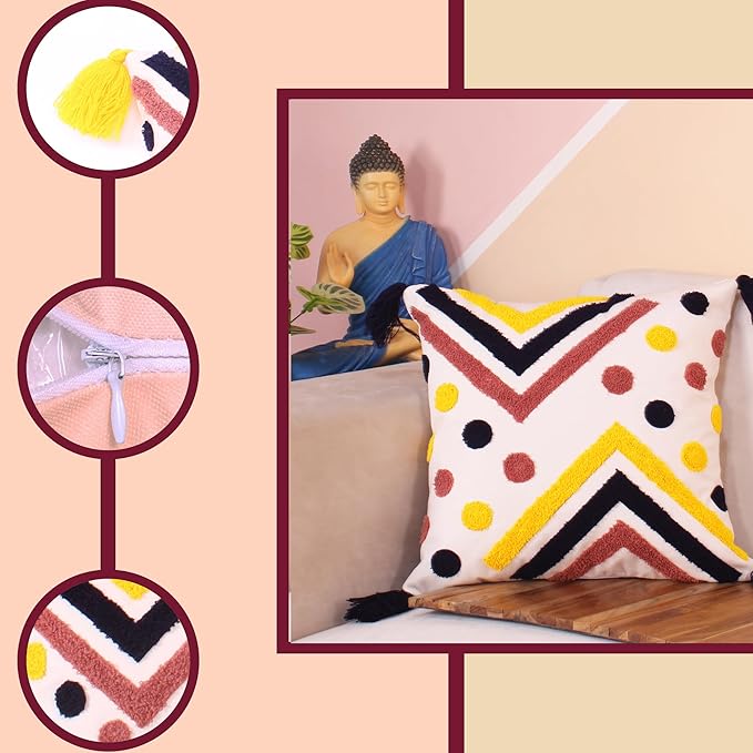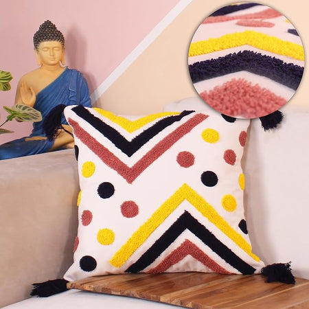 Made from high-quality fabric with durable stitching, this cushion cover is designed to last while maintaining its premium look. The black tassels at each corner add a playful and stylish finishing touch, making it a standout décor piece in any modern or boho-inspired home.